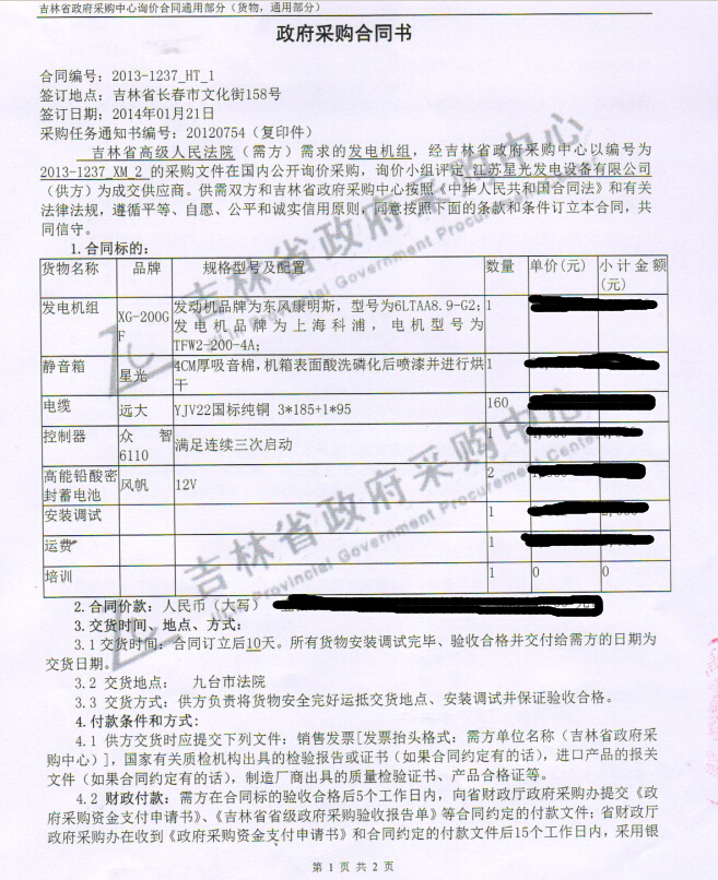 吉林省高級人民法院政府采購200KW發電機組:
